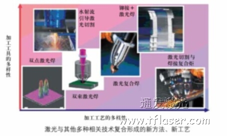 就拿激光焊接技術(shù)來說,在激光復(fù)合工藝的發(fā)展中已出現(xiàn)了如雙點(diǎn)或雙束激光的復(fù)合、激光與電弧的復(fù)合、激光與攪拌摩擦熱復(fù)合以及激光與電阻熱復(fù)合等形式;并呈現(xiàn)與其他相關(guān)技術(shù)結(jié)合及功能延伸的趨勢(shì),如與水射流、鉚接等結(jié)合而形成的新工藝(見圖)。