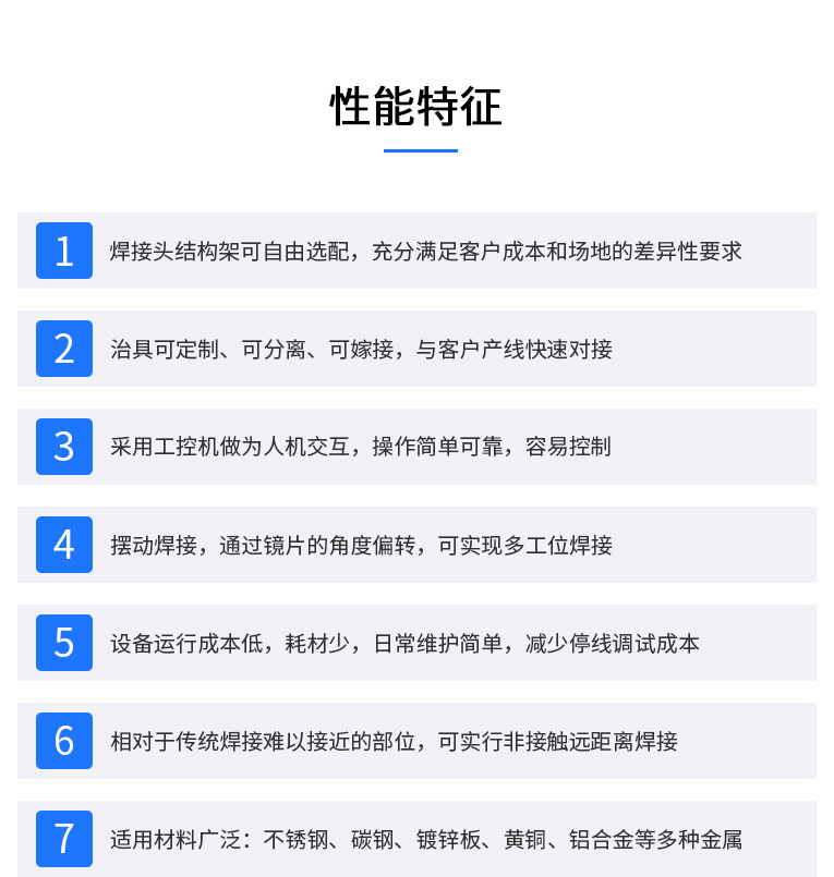 2、強大的PC控制,易于編程、調試和維護。可完成自動或半自動的點焊、對接焊、疊焊、密封焊,針對復雜的平面直線、圓弧及任意軌跡的焊接。
